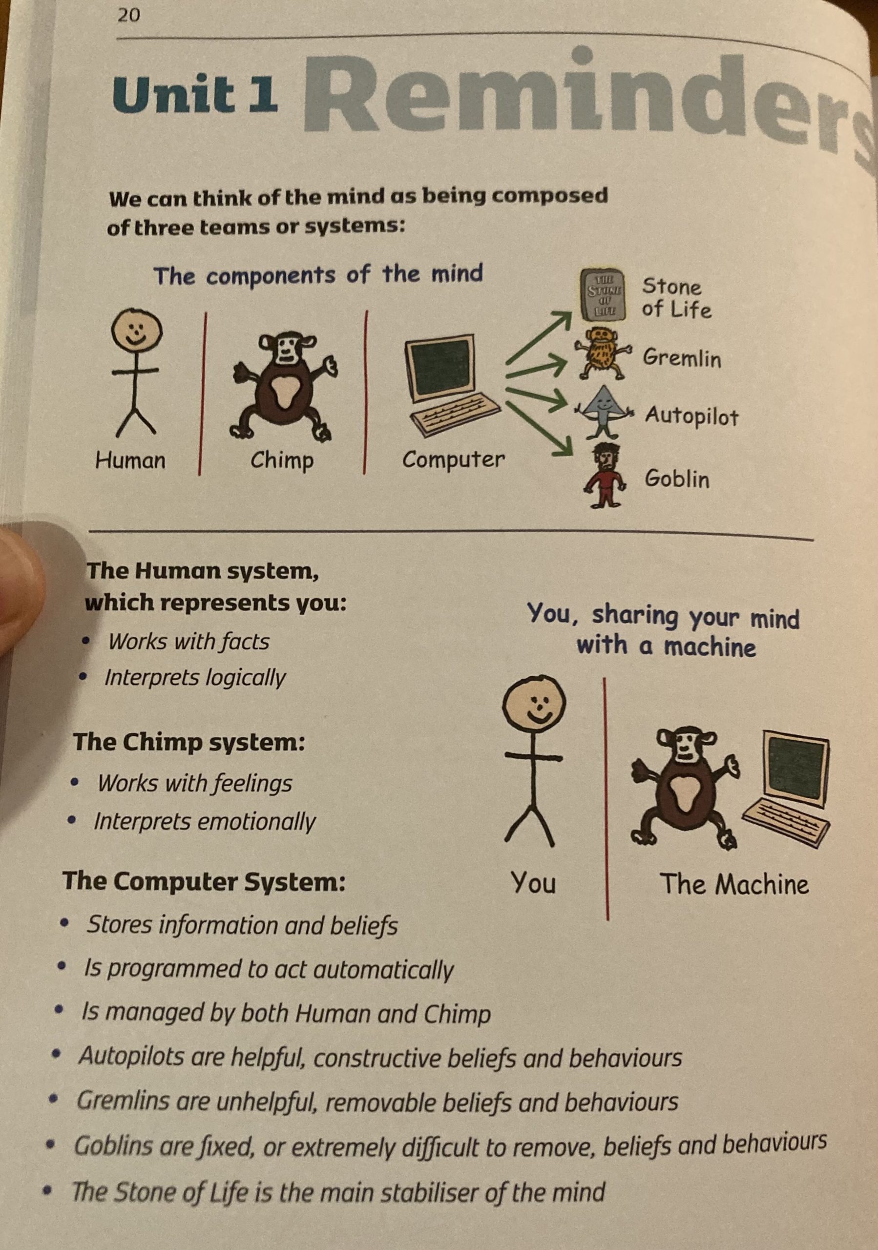 Steve Peters’s A Path Through the Jungle is a unique and valuable guide to self-understanding and self-regulation. The book is presented in seven “Stages,” each of which is comprised of “Units” that build on each other sequentially. The core set of ideas is what Peters calls the “Chimp Model,” summarized in this image from Unit One: